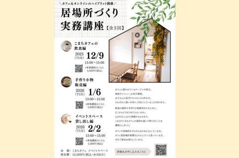 こまちぷらすで、定期的に開催している『こまちカフェの飲食編』『手づくり小物販売編』『レンタルスペース貸し出し編』の3回シリーズの居場所づくり実務講座が12/9(火)よりスタートします。 カフェに置かれているテーブルや椅子...
