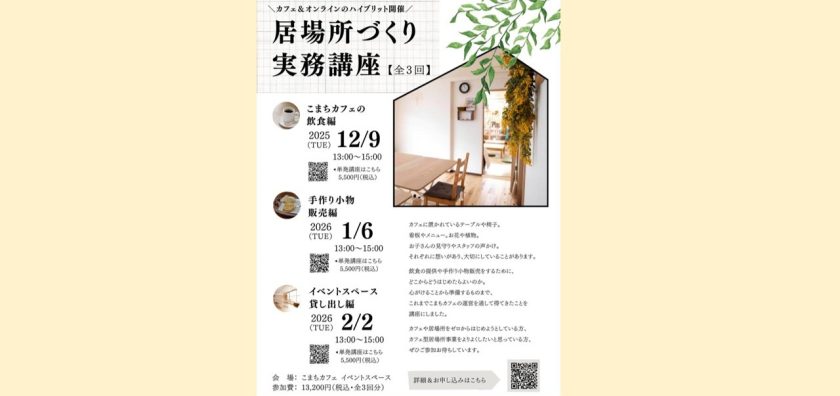 こまちぷらすで、定期的に開催している『こまちカフェの飲食編』『手づくり小物販売編』『レンタルスペース貸し出し編』の3回シリーズの居場所づくり実務講座が12/9(火)よりスタートします。