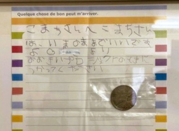 この写真は、2歳くらいからこまちカフェに通ってきている一人の男の子が、2022年6月10日前後(ちょうど3年前)にお手紙をもってきてくれたときのものです。そのお手紙には、「こまちさんへ こまちさんはいままでどおりでいいですよ。おおきなプロジェクトのときにつかってください」とあって、十円玉がはりつけてありました。