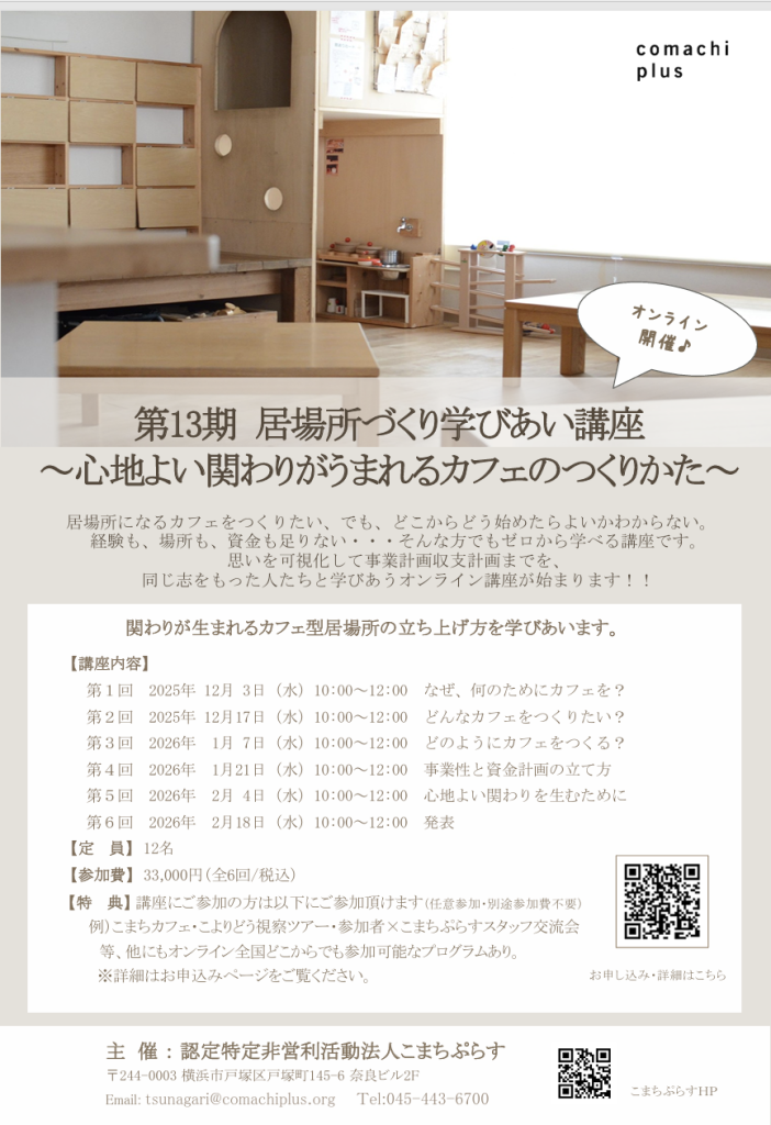 こまちカフェ・こよりどうカフェを運営してきた私たちの試みを事例としてお伝えしながら、皆さん自身の作りたい居場所について考える講座です!