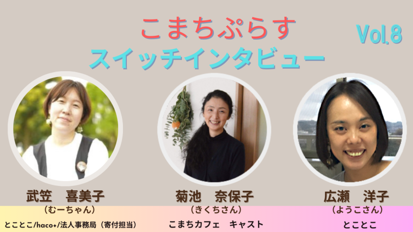 2024年度からスタートしたスイッチインタビューも8回目を迎えました。今回は戸塚区役所内にある、「とつかの子育て応援ルーム とことこ(通称:とことこ)」で曜日替わりで勤務、または勤務経験のある、広瀬・武笠・菊池の3人で話をしました。※とつかの子育て応援ルーム とことこ