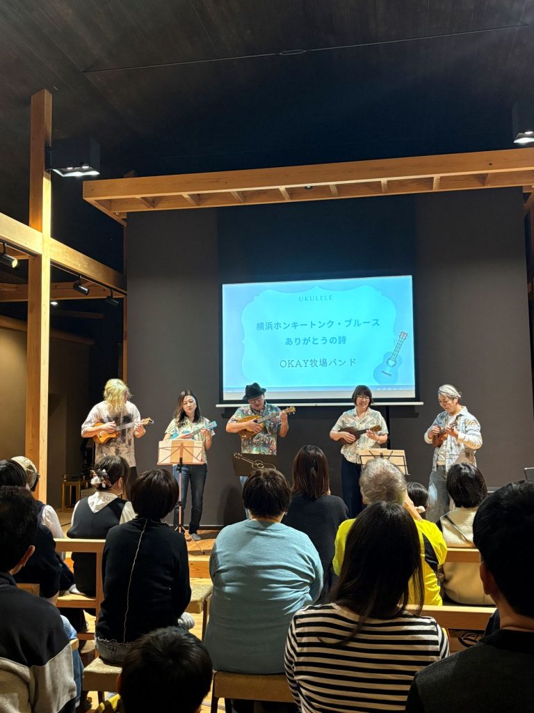 こまちぷらすのスタッフのほか、こまちぷらすを応援してくださっている方にもお声かけして出演者を募りました。一番に手をあげてくださったOKAY牧場バンドは「いつでもだれでも入ってOKのバンド」で、音楽でつながった地域の方々による歌やウクレレ演奏で盛り上げてくださいました。