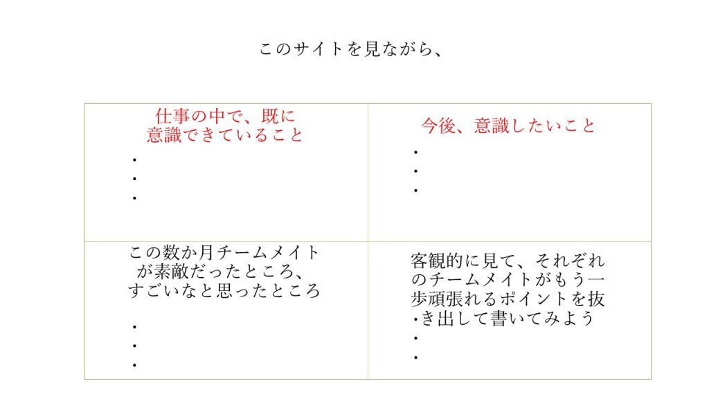今回は、新しくなったこまちぷらすのHPを閲覧しつつ、こまちぷらすのビジョンやミッションと自分自身の仕事を繋げて考えたり、チームメイトの良いところや工夫点をフィードバックしたりするワークを行いました。定期的に自分の仕事を振り返ったり、チームメイトの存在を再認識することで、仕事へのモチベーションが維持できるようになるのではないかと感じます。