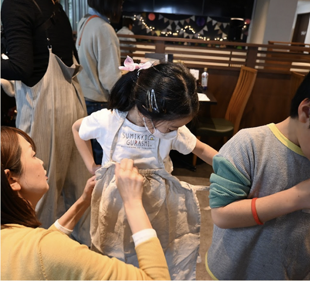 - 手縫いやミシン縫いに取り組み、初めてミシンに触れるお子さんもいましたが、高校生や大人のボランティアの方々が丁寧にサポート。ミシンを貸し出してくださった方々のおかげで、一人で一台のミシンを使えるという恵まれた環境で制作を進められました。