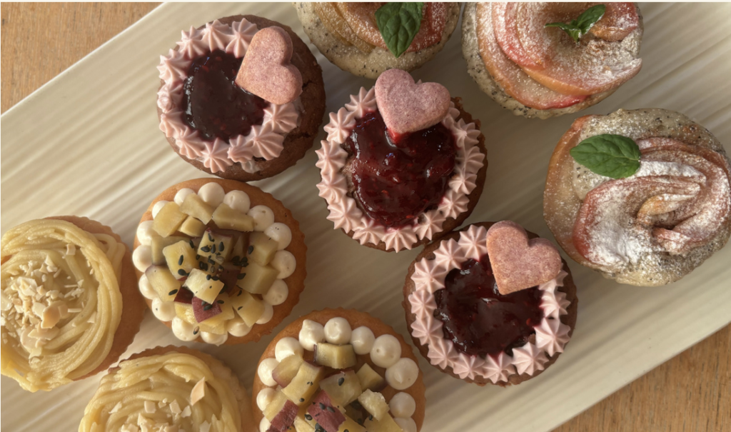 当日までに、 子どもたちのアイデアから、秋の味覚をテーマにした「りんご、栗、ココア」の3種類のフレーバーのアイデア出し。季節感のある「秋色カップケーキ」とし、それぞれの商品名も「秋のさつまいもモンブラン」「秋のりんごと紅茶のケーキ」「ココアとまっかなベリーのケーキ」と命名しました。
