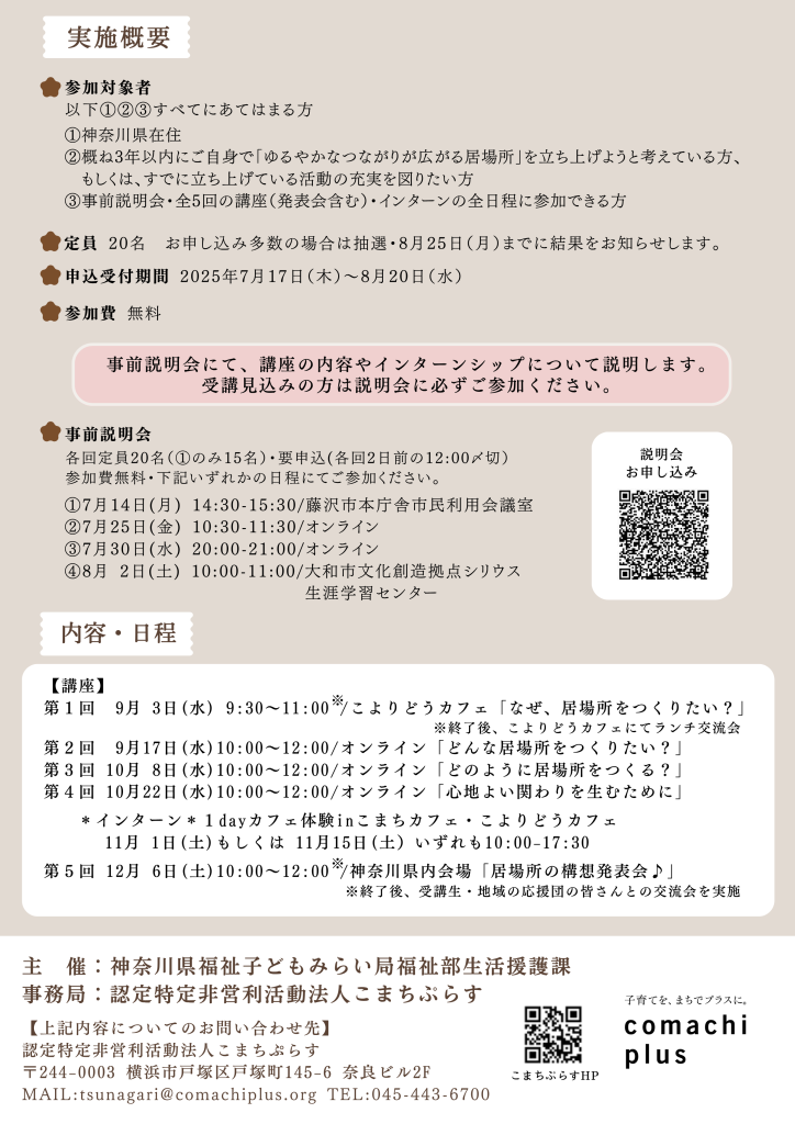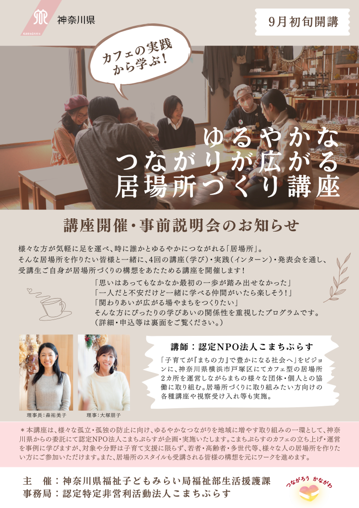 この度、神奈川県福祉こどもみらい局福祉部生活援護課からの委託により、2025年9月より「カフェの実践から学ぶ!ゆるやかなつながりが広がる居場所づくり講座」を開催することになりました!