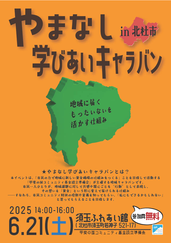 インフォメーション 【登壇情報】“地域の資源”を未来につなぐしくみを考える日 やまなし学びあいキャラバン@北杜市(6/21) 2025/06/20 by 松本茉莉 6/21(土)「市民の力で地域に新しい資金循環の仕組みをつくる」ことを目指す、甲斐の国コミュニティ基金設立準備会主催の元、須玉ふれあい館にて「やまなし学びあいキャラバン」にて、代表森が登壇します。甲斐の国コミュニティ基金設立準備会では、山梨の現場で見えてきた「資金」「人」「つながり」の課題に向き合いながら、市民コミュニティ財団の設立を目指しているそうです。詳細はこちらよりご覧ください。 山梨県, 登壇情報