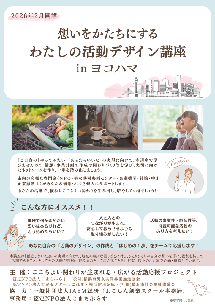 横浜市内の4団体と連携し、自分の「やってみたい」や誰かの「あったらいいな」を叶える応援をする講座を2026年2月より開催いたします!