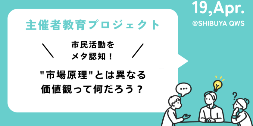 4/19(日)に、「市民活動をメタ認知しよう~市場原理とは異なる価値観って何だろう?~」というテーマで、NPOや市民活動とは何なのかを、NPO法の主旨や、定番の解釈に縛られすぎず、実践者や支援者どうしで話し合うイベントが開催されます。